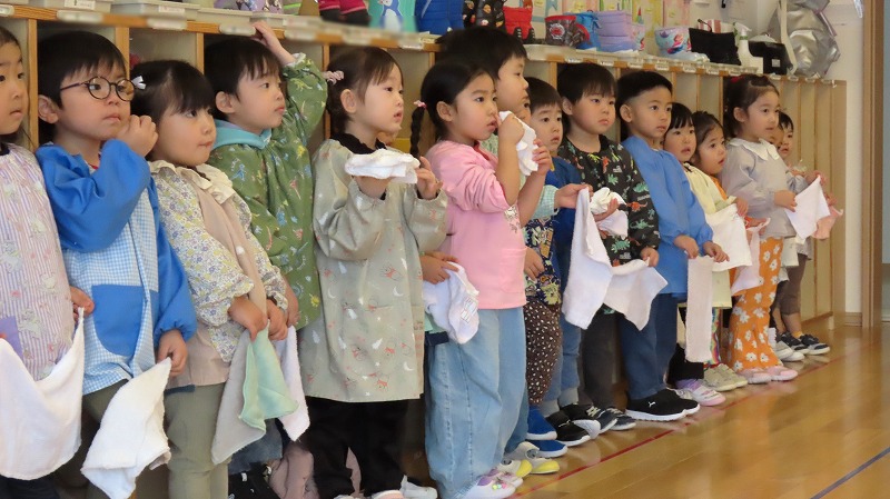 今日で2学期が終了しました。終了式では、2学期をスライドショーで振り返るとともに先生から冬休みの約束などを聞きました。楽しい冬休みを過ごし、3学期から元気に登園してほしいと思います。良いお年を!