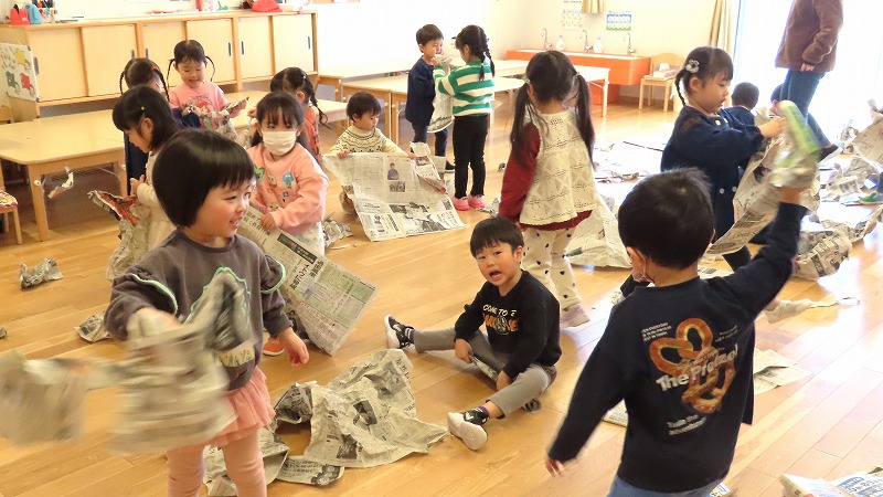 今日は,年少さんが新聞遊び,年中さんはクラス一緒に朝の自由遊び,年長さんは卒園式の練習でした!