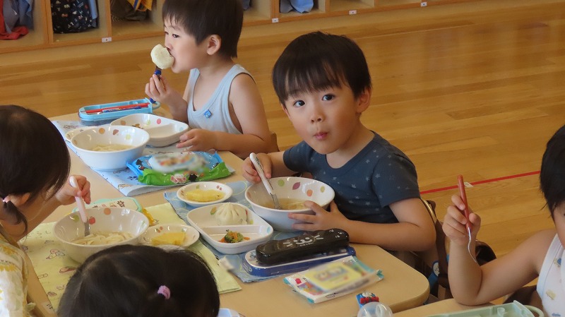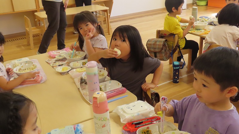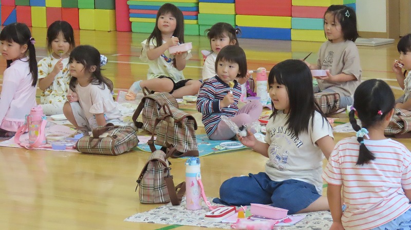 今日は雨のため、うさぎ・ぱんだ・きりん組の遠足は延期になりました。そのかわり全学年で体育館でゲームなどをして楽しみました。また、遠足が延期になったクラスは、体育館で遠足気分でお弁当を食べましたよ!