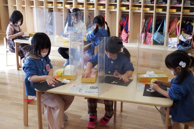 年少さんの今日の予定は,お散歩をしながら避難所(鳥取中)までの経路を知り,公園で遊んで帰ってくるはずでしたが,雨天のため後日に延期となりました。年中,年長さんは英語遊びです。元気な声が遊戯室に響いていました。