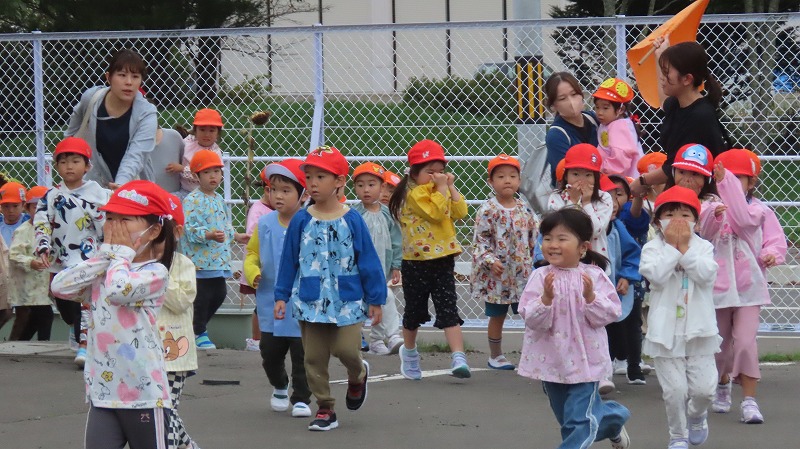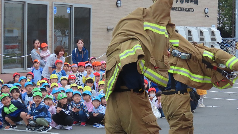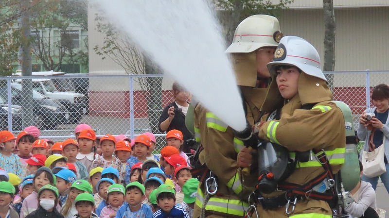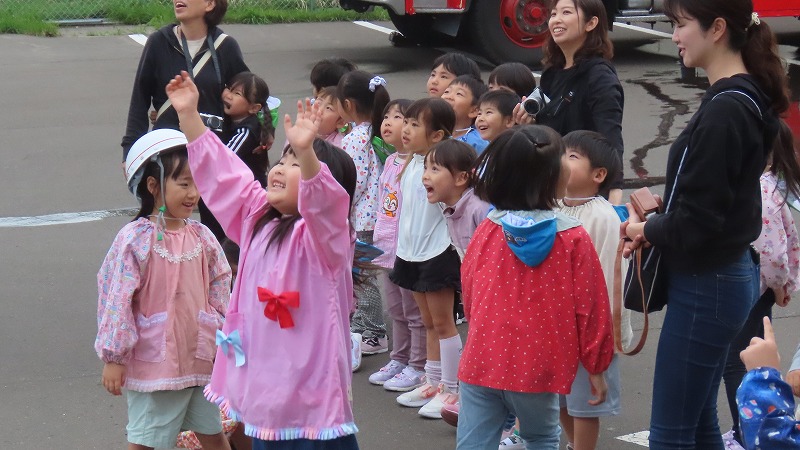 今日は「地震のあとに火災が発生した」と想定して避難訓練を行いました。西消防署のご協力により放水訓練の様子を見学させていただきました。また、年長さんは消防車(クレーン車)に乗る体験もさせていただきました。