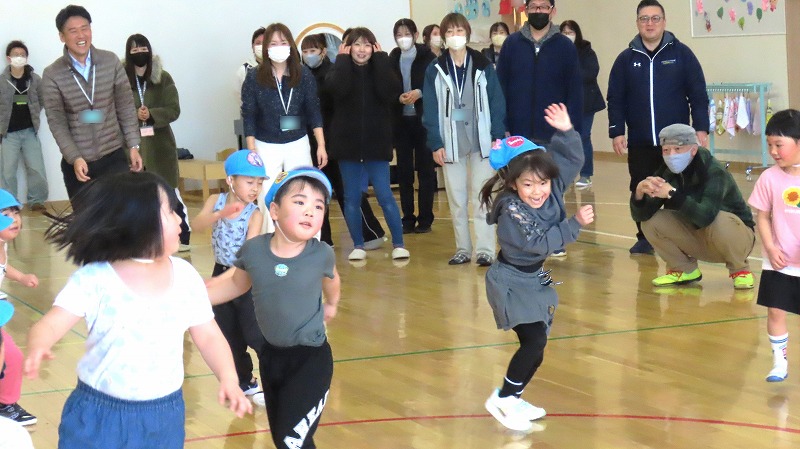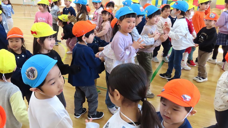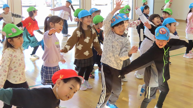 今日は,みんなで体育館でゲームをしたり踊ったりして活動しました。学年の枠を越え,年長さんも年少さんも一緒に遊びましたよ!