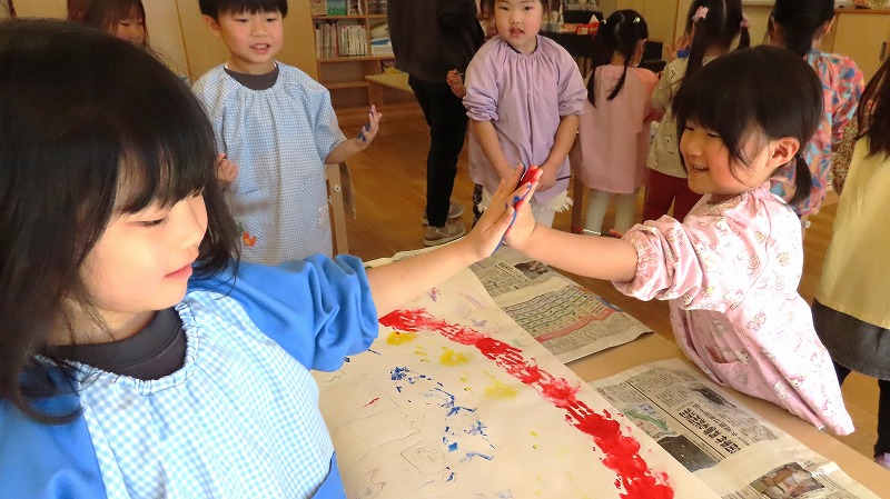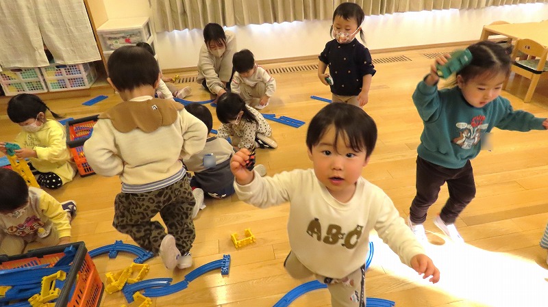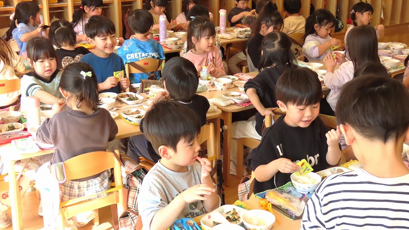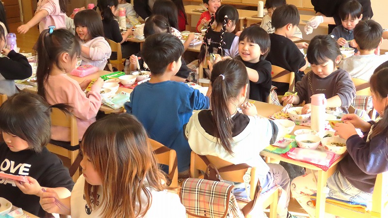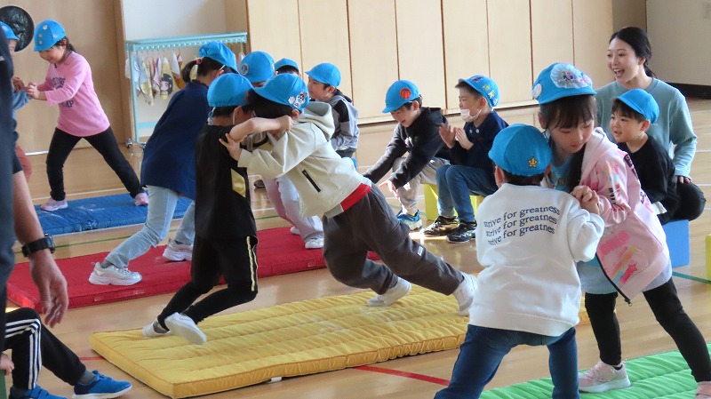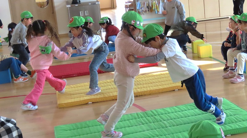 今日の年少さんと年長さんは体育遊びをしました。年長さんは押し相撲をしてたのしみました。一方,年中さんは2クラスが一緒にお部屋で給食を食べ,賑やかな給食時間となりました!!