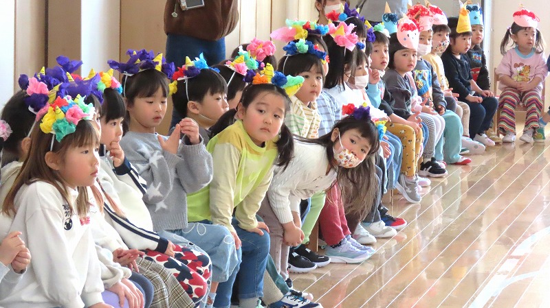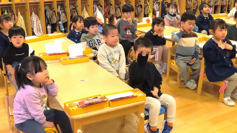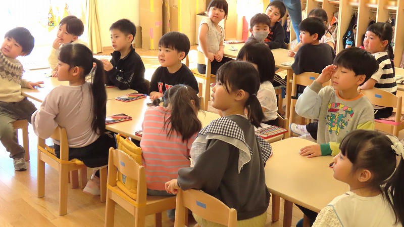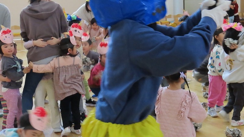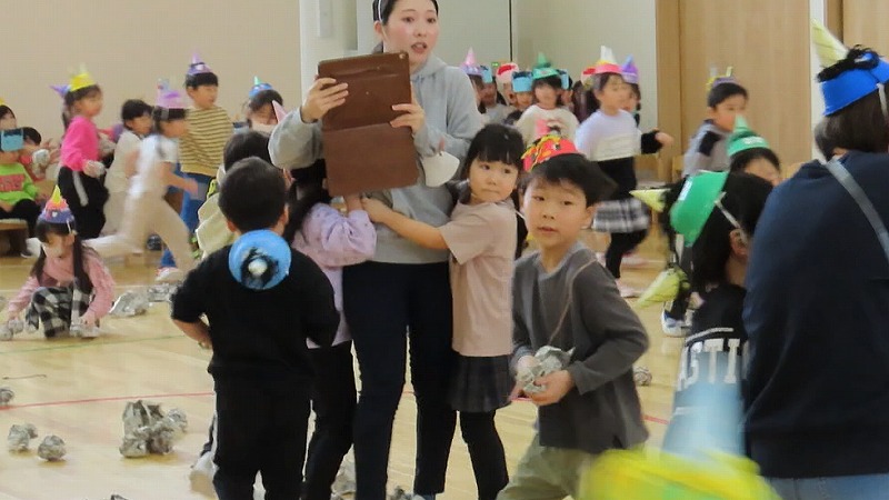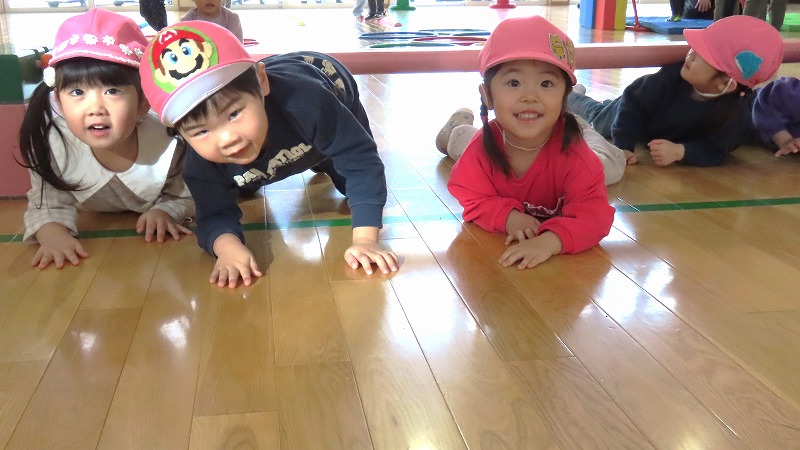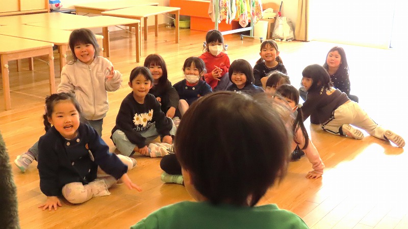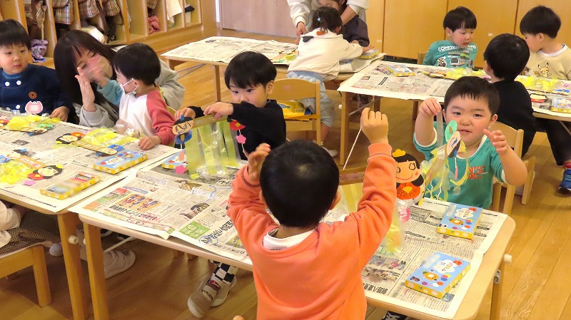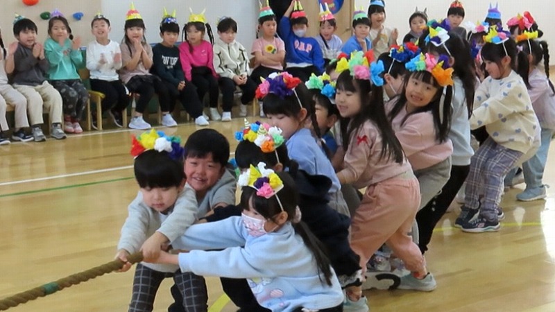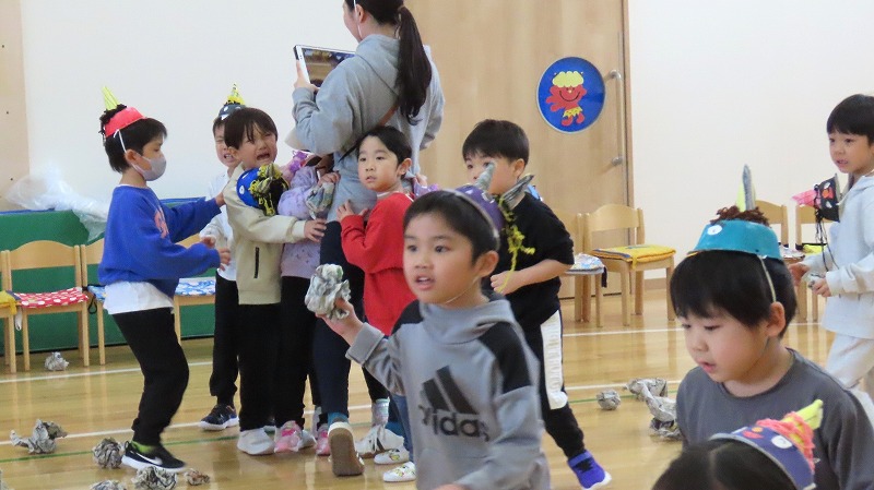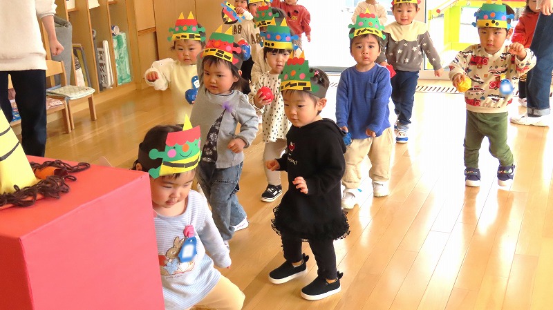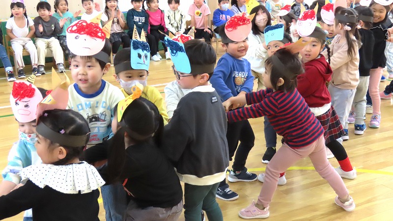 今日は節分。みんなで「まめまき集会」をしました! 節分とはどんな日なのかを先生から学び,綱引きでパワーをつけ鬼をやっつけました!! 年少さんだけに限らず,年中・年長さんの中にも泣き出す子がけっこういましたよ。