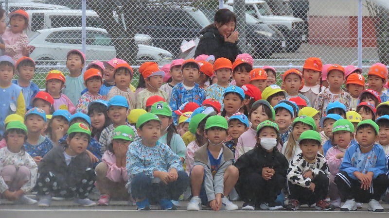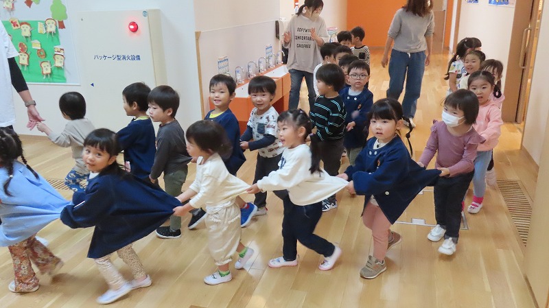 今日は「地震のあとに火災が発生した」と想定して避難訓練を行いました。西消防署のご協力により放水訓練の様子を見学させていただきました。また、年長さんは消防車(クレーン車)に乗る体験もさせていただきました。