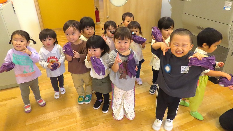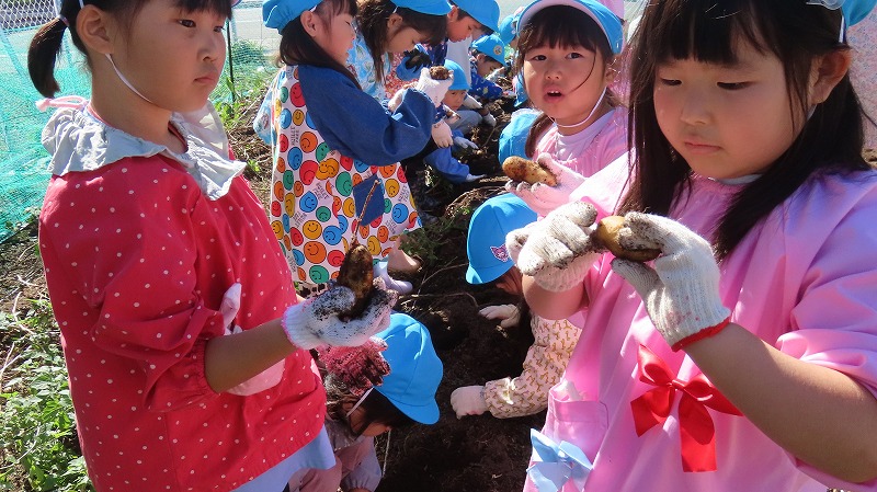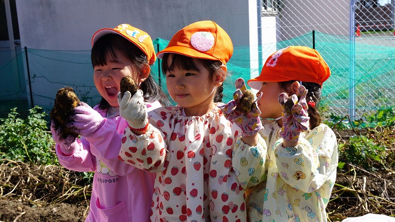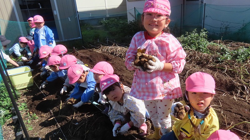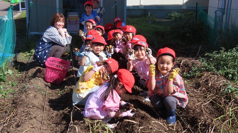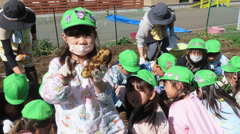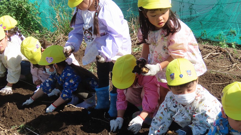 今日はいも掘りをしました。今年は高温だったり大雨の影響でいもの生育が悪かったりして豊作とはなりませんでした。でも、中には大きないもを掘り出すお友だちもいましたよ!