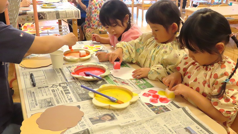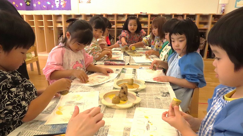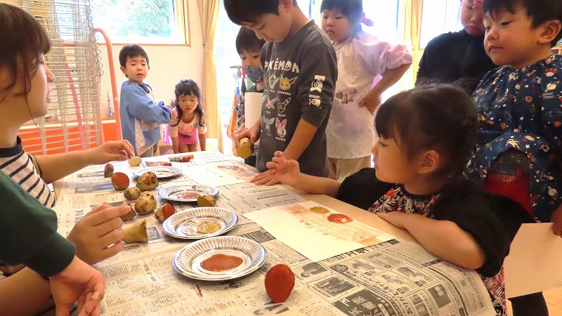 年中さんのクラスでは,先日収穫したイモを使って製作に取り組みました。秋らしい楽しい作品ができましたよ!