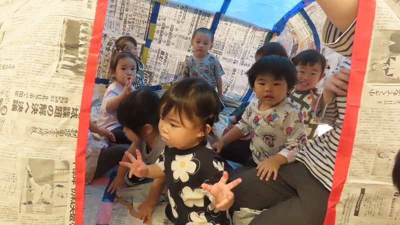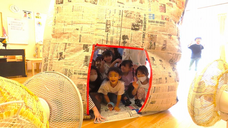 今日は、ぱんだ組で大きな新聞ドームを作りました。風を入れて大きく膨らんだドームの中に子どもたちが入って遊びましたよ! みつばちさんにも声をかけ、ドームに入ってもらいました!!