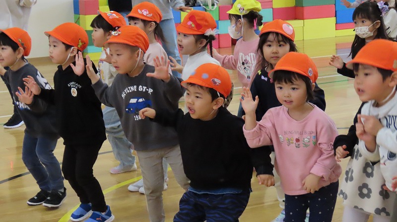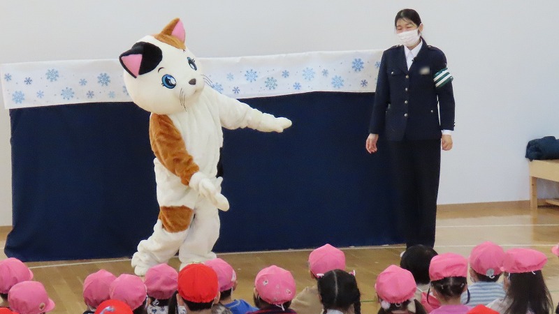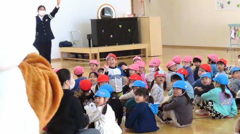 今日は、市役所の交通安全課の皆さんに来園いただき、冬の交通安全教室を実施しました。子どもたちは横断歩道のわたり方や、冬だからこそ注意しなければならないことなどを学びました。
