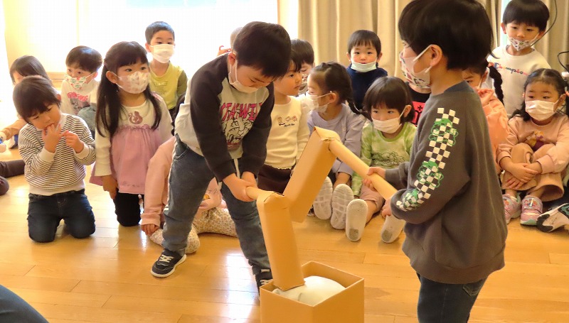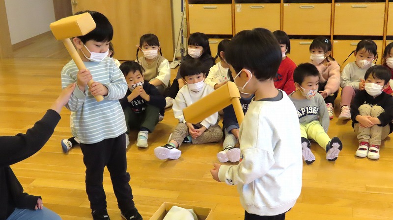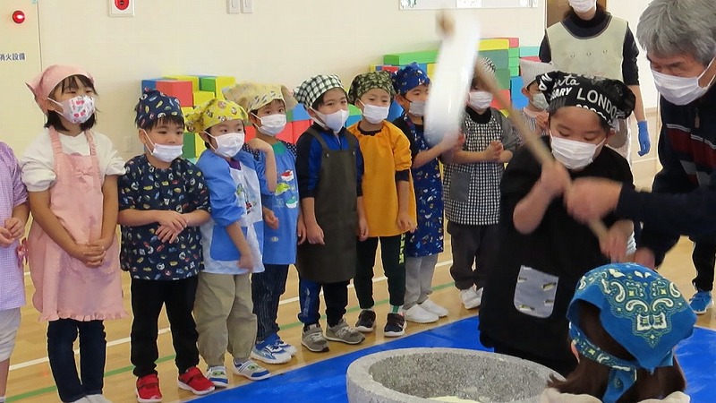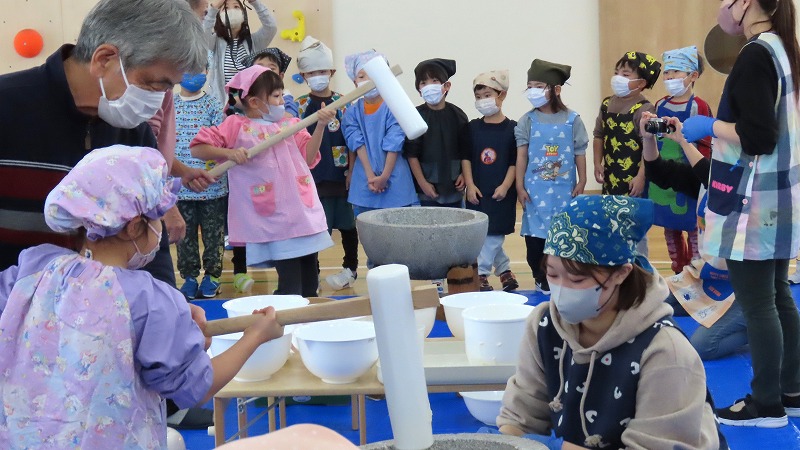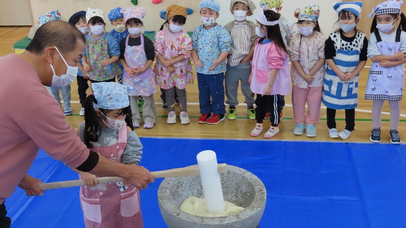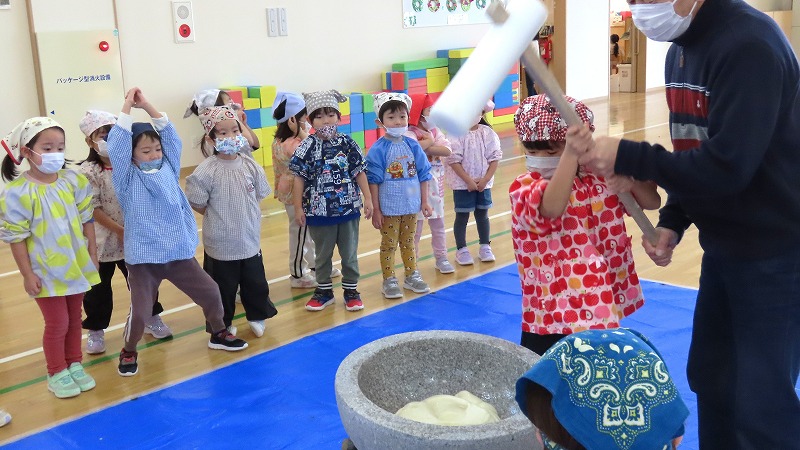 今日は、きちべい(お米屋)さんのご協力で餅つきをしました。「よいしょ!」のかけ声とともに、懸命にもつをつく園児たちでした! 一方、年少さんは餅つきの見学と疑似体験をしてたのしみましたよ!