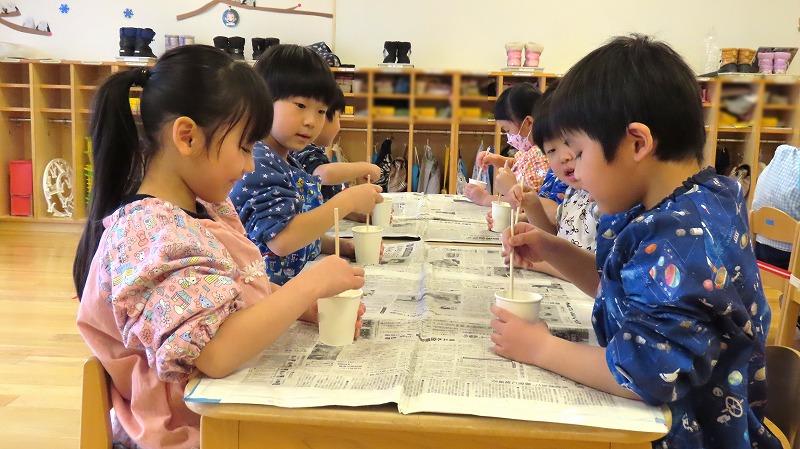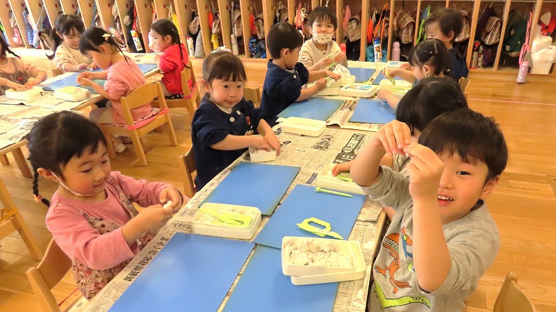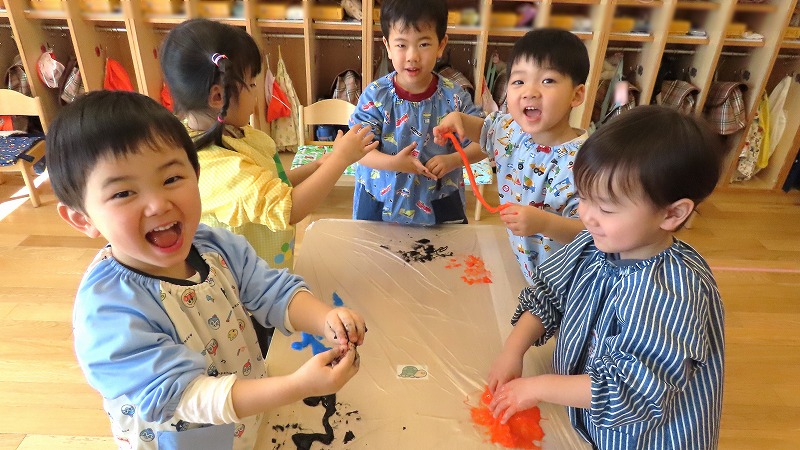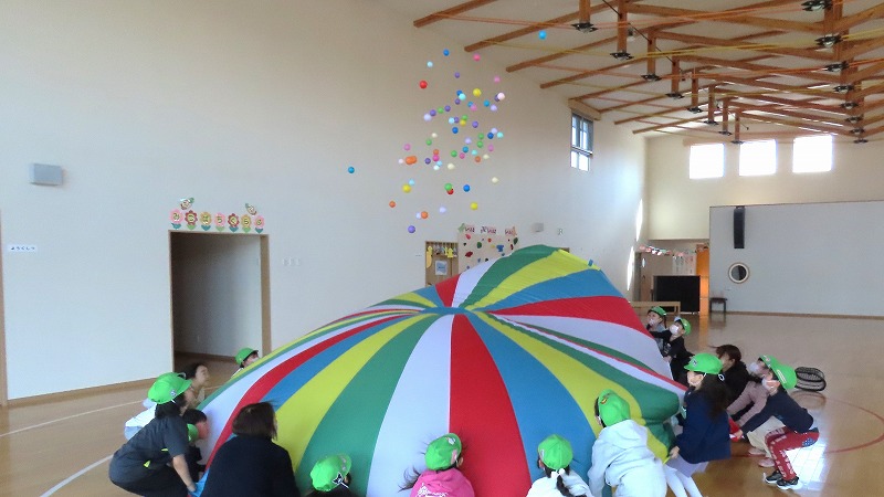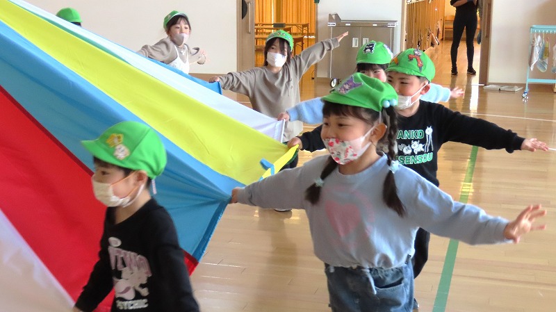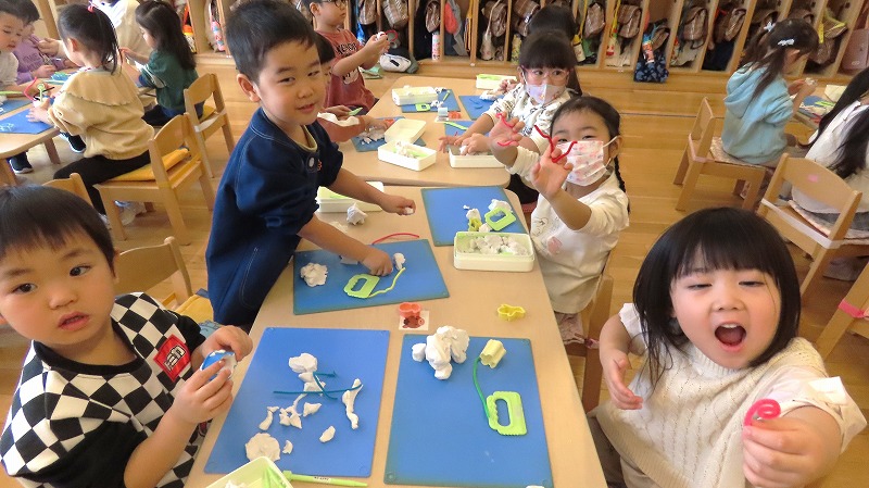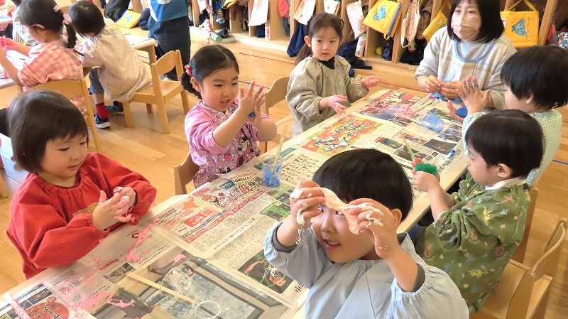 今日の年少さんはスライムづくりに挑戦しましたよ! らいおんさんは運動会で披露したバルーンに久しぶりに挑戦しました。もう9ヶ月も前のことなのに,みんなで力を合わせ見事に表現していました!