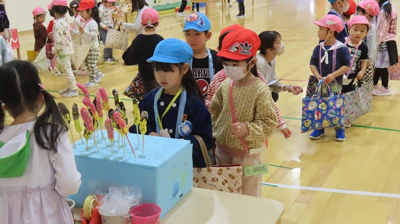 今日は全学年お店屋さんごっこをして楽しみました! たこやき、お寿司、ドーナッツなどの食べ物屋さんのほか、お面や金魚すくいなどお店屋さんが並びました。
