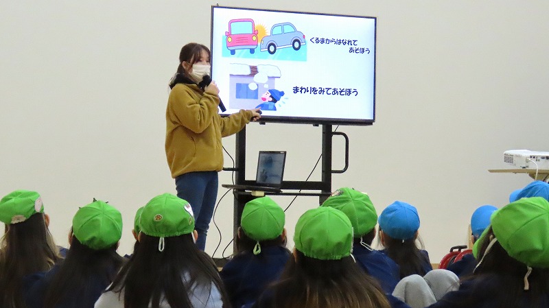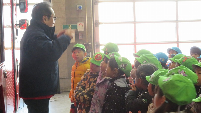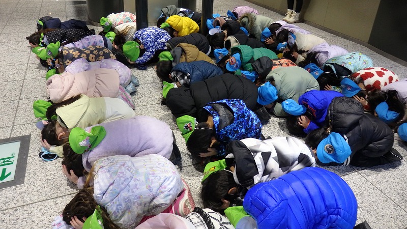 今日、2歳児の、みつばちさんのクラスでは親子でクリスマス会が行われました。サンタさんもやってきましたが、みんな「この人だ~れ?」という感じでサンタさんをみつめていましたよ! 一方、年長さんは防災センターに出かけ、地震や火事などの災害ついて学びました。